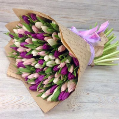Высота стебля тюльпанов 40-50 см, кол-во в букете 101 шт.