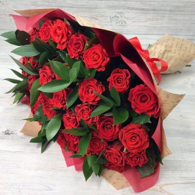 Кол-во роз в букете 25 шт. высотой 50-60 см + 10 веточек зелени рускус