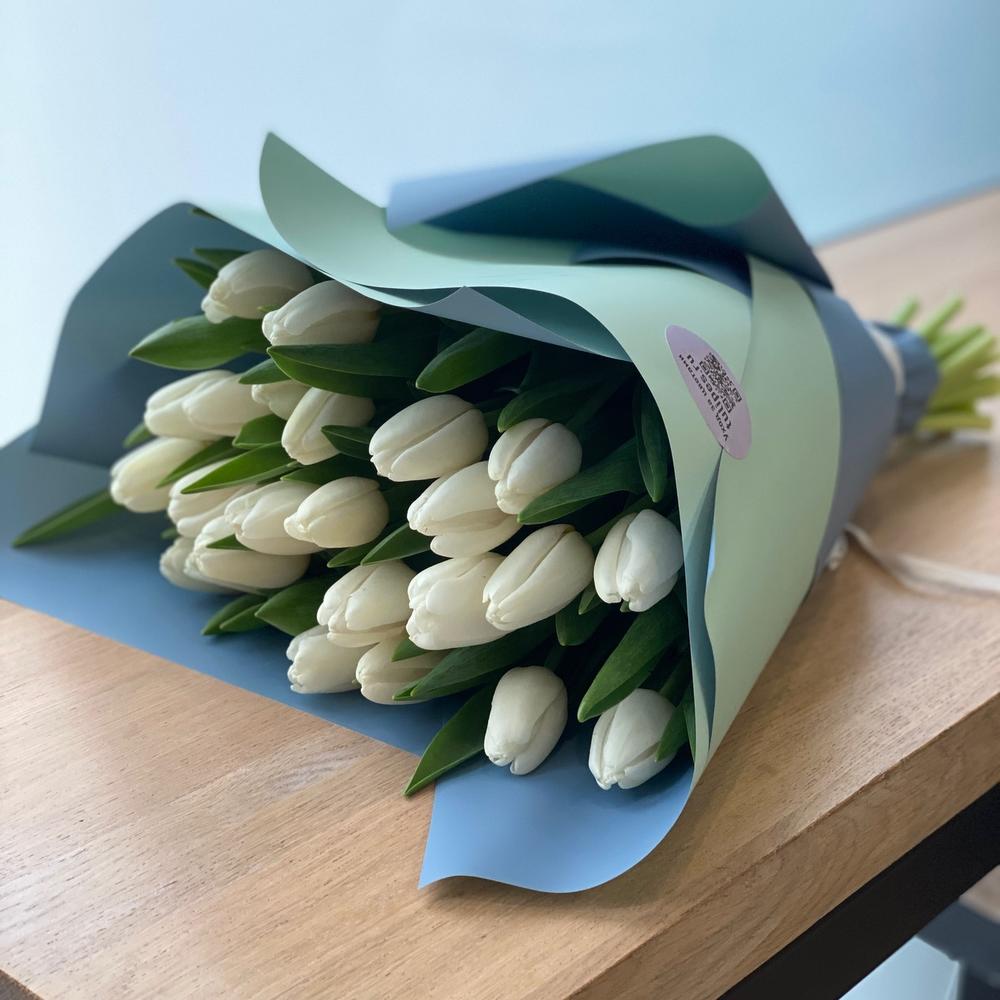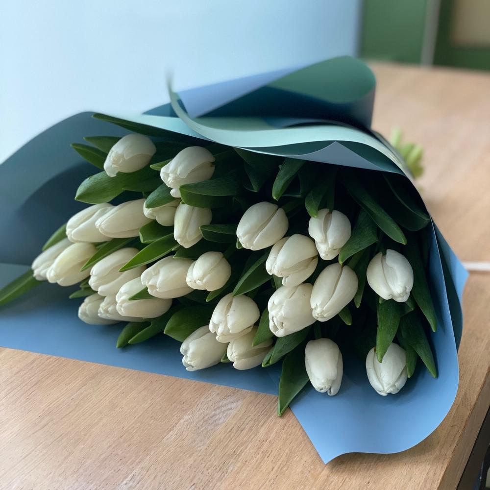 Белые тюльпаны в морозный день, выглядят как никогда нежно и хрупко, именно поэтому дарить весенние цветы зимой всегда оригинально 🌸🌸🌸. Вытянутый стебель и бело-дымчатый купол в сочетании с холодными оттенками упаковки, не оставит равнодушными самых утонченных натур🎨🖼️🎼. Такой лёгкий букет, без сомнений, подойдёт в качестве подарка любимому человеку❤️❤️❤️. Дарите любовь и получайте больше взамен🕊️🕊️🕊️.