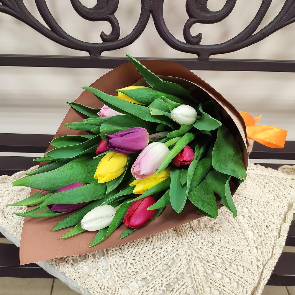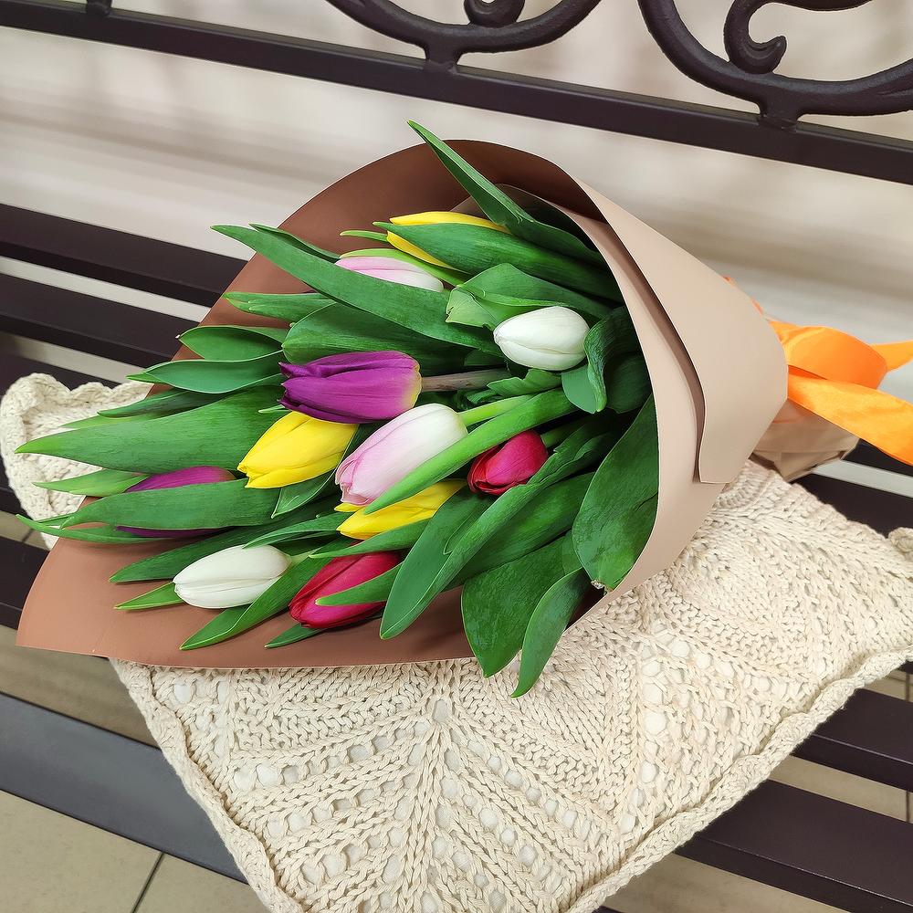Яркий букет из свежайших тюльпанов разного цвета. Отличный подарок на 8 марта. Тюльпаны упакованы в дизайнерскую пленку и перевязан атласной лентой. Букет станет прекрасным подарком для Ваших близких или приятным комплиментом для Ваших партнеров и коллег. Порадуйте своих близких букетом свежих тюльпанов в прекрасный международный женский день 8-ое марта!