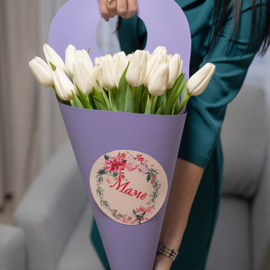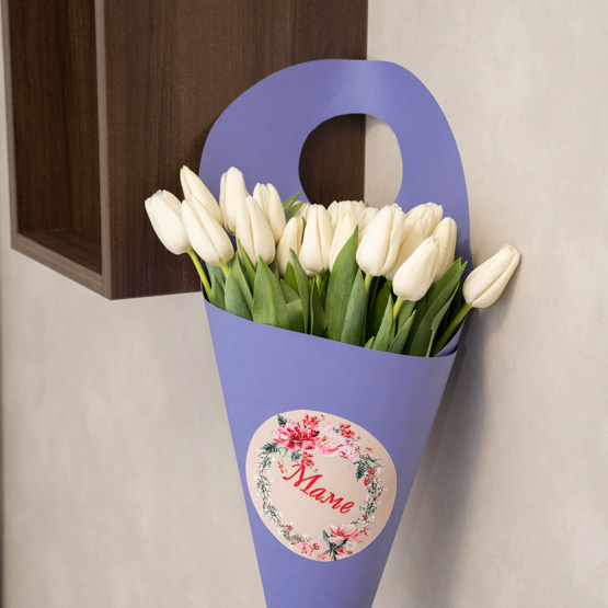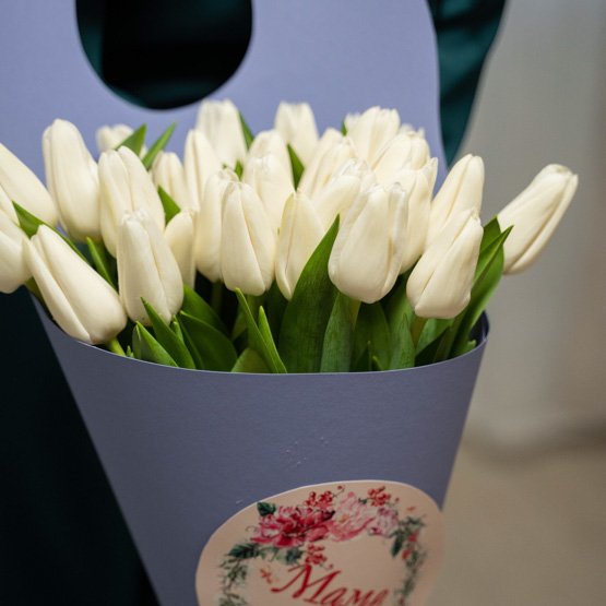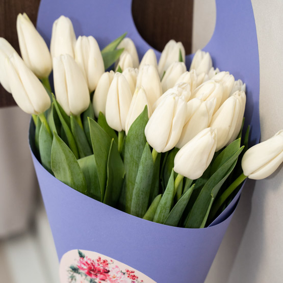 Цвет тюльпанов можете указать любой (белый, желтый, розовый, фиолетовый, бело-розовый)
